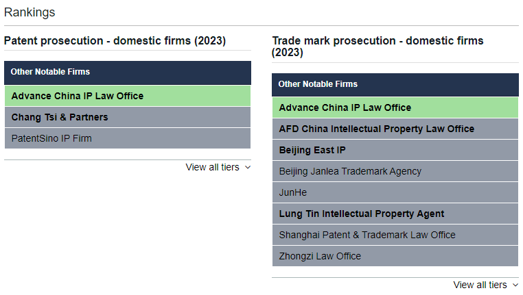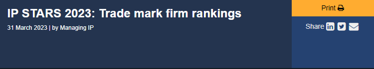 此前,“2023年度 IP STARS 商标榜单”已于今年3月公布,华进凭借专业的商标团队和高质量的客户服务能力,荣膺2023年中国区商标确权领域(Trade mark prosecution - domestic firms 2023)“知识产权之星”(IP STARS)推荐事务所。