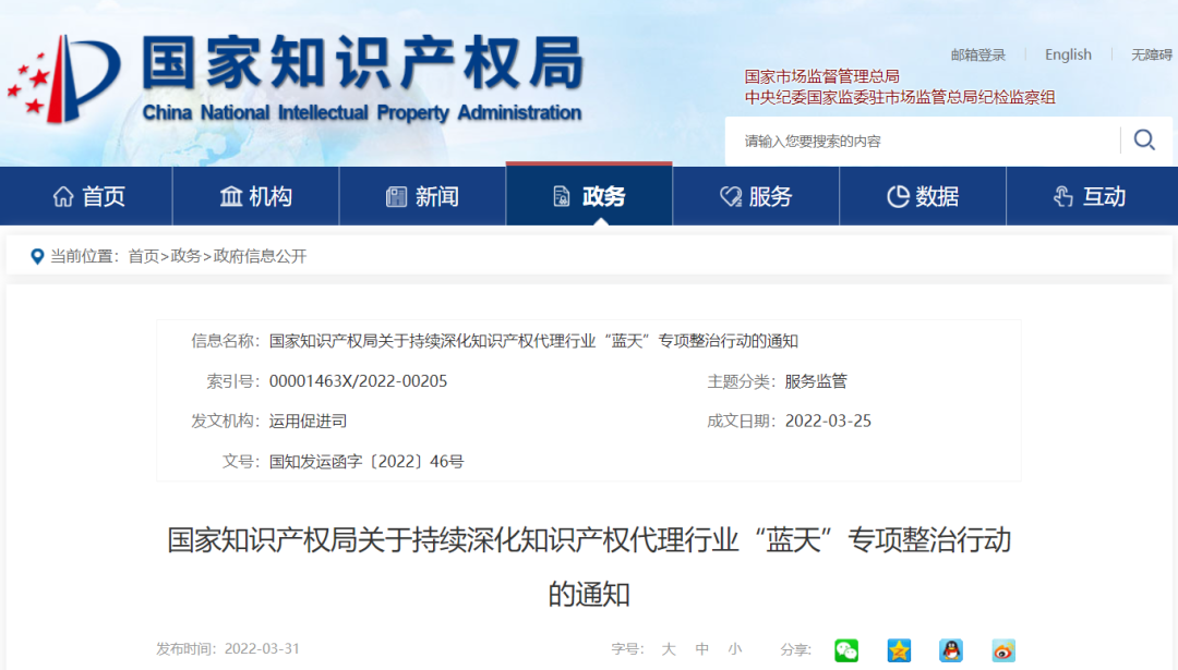 为深入贯彻《知识产权强国建设纲要(2021—2035年)》《“十四五”国家知识产权保护和运用规划》相关决策部署,落实2022年全国知识产权局局长会议精神,持续保持严厉打击知识产权违法违规代理行为的高压势态,确保专项整治劲头不松、措施不软、势头不减,有效维护行业秩序,有力促进知识产权服务业健康发展,现就2022年持续深化知识产权代理行业“蓝天”专项整治行动的有关事项通知如下: