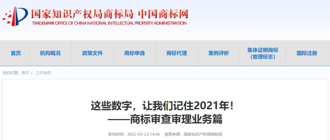 这一年,商标局认真落实国家知识产权局“八大专项行动”和“百项实践活动”等12项任务,并延伸拓展服务群众的20项具体举措,积极为群众排忧解难;统筹推进“八项改革”,稳步推进商标审查审理提质增效,积极运用商标工作服务经济高质量发展。商标局与各地方商标审查协作中心在建党百年的伟大时刻交出了属于商标人的一份合格答卷。今天,我们用这些数字回顾2021年,记住商标人在“十四五”开局之年作出的积极贡献!