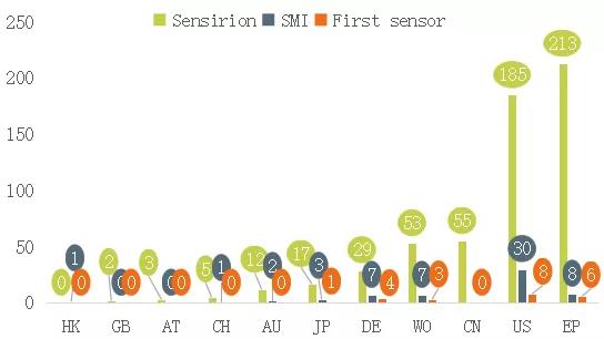 SMI于2002年被瑞思迈并购。First sensor为德国企业,Sensirion为瑞士企业,盛思锐贸易(深圳)有限公司是SENSIRION的全资子公司,在整个中国地区负责SENSIRION产品的销售和服务。另,Honeywell为行业龙头企业,专利数量大,本次不作分析。