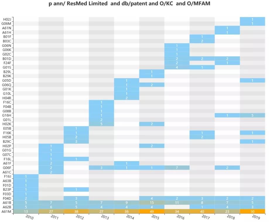 从上图及表中可知,费雪派克与瑞思迈间的专利引用交集大,产品技术重叠度高,竞争最为激。怡和嘉业作为国内企业,可能是因为主要申请在国内,在审查中很少用到其它同行在先专利申请,很少有相互引用的数据体现。