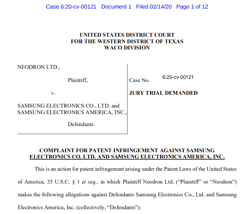 2020年2月14日,Neodron向三星电子提起诉讼,称其侵犯专利权,涉案专利 Nos. 7,821,425 (“’425 Patent”); 7,903,092 (“’092 Patent”); 8,749,251 (“’251 Patent”); and 9,411,472 (“’472 Patent”)。案件编号:6:20-cv-00121。