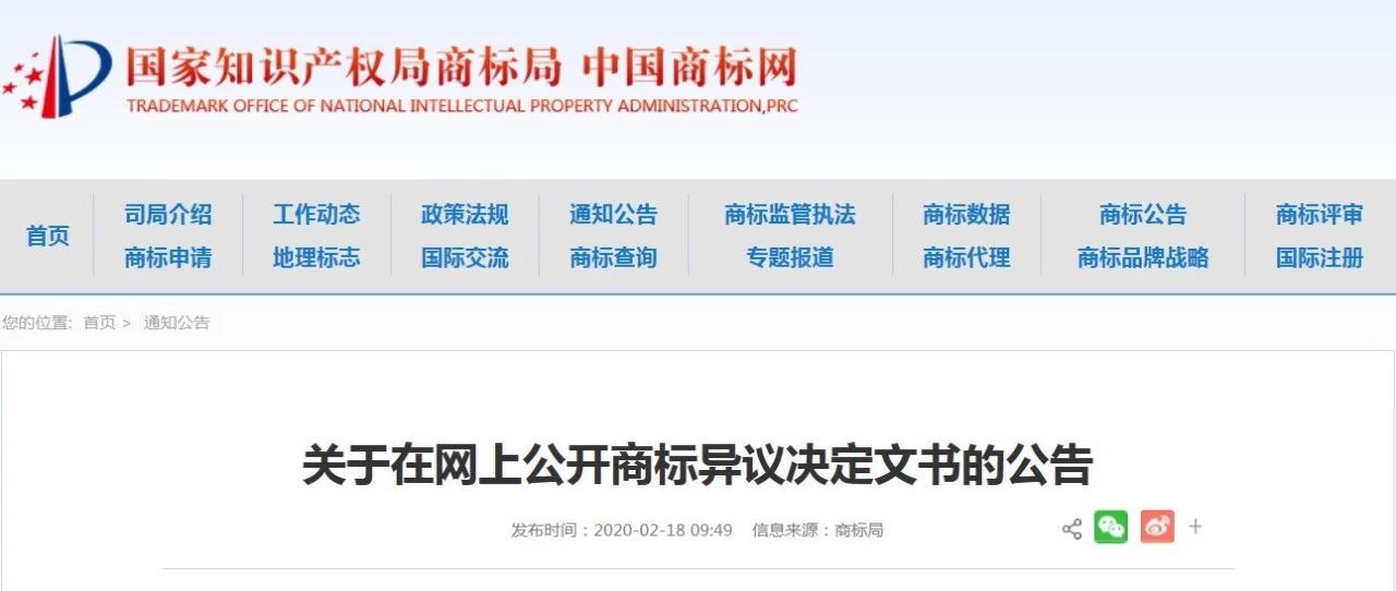 关注!国知局商标局发布关于在网上公开商标异议决定文书的公告