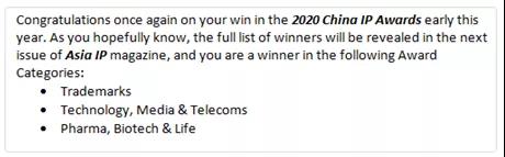 据了解,《亚洲知识产权(Asia IP)》每年都会通过问卷调查、核心客户咨询等方式评选出亚太地区在专利、商标、版权等领域表现杰出的优秀知识产权事务所及律师。该项评选已有超过10年的历史,在亚太地区具有较高的权威性,拥有重要的参考和指导意义。本届年度奖项评选基于全球各地的数千位公司内部顾问、法务人员、企业高管及法律界专家的投票及推荐产生。
