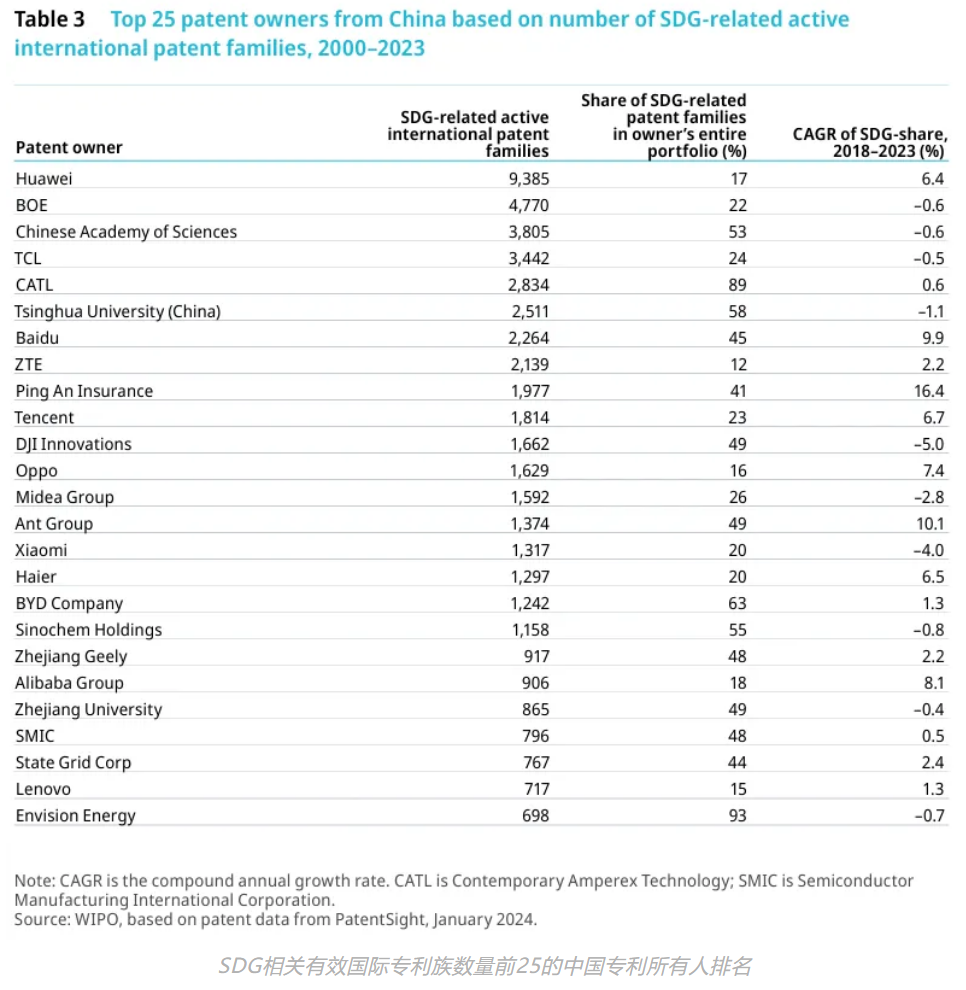 SDG相关专利申请活动在世界各地均有增加,不过中国近年来的专利申请量呈指数级增长。在中国申请人排名中,以华为为首,其次是BOE、中国科学院和TCL。